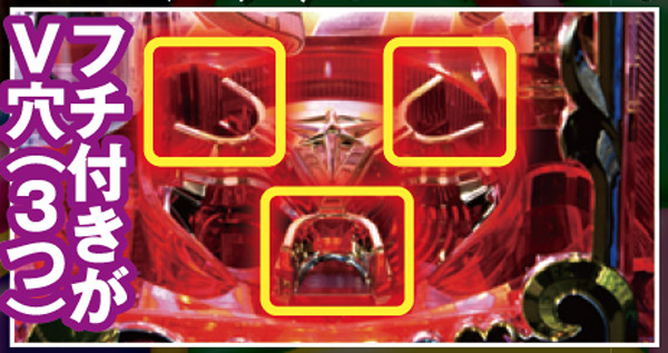 3個あるV穴は、単発入賞だと玉を弾きやすい傾向に。複数同時入賞すると、玉が干渉し合い勢いが弱まり入賞率が高まるのだ。