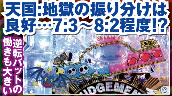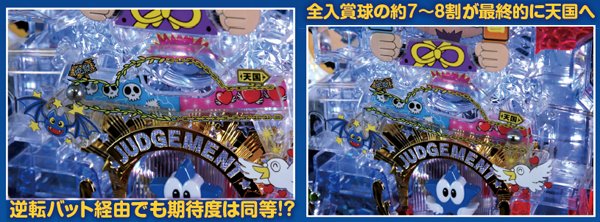 | 機種概要 | 運命を左右するブリッジや手に汗握る回転体は踏襲しつつ、地獄ルートを回避する逆転バットが搭載されるなど、より進化を果たして西陣の名機が現代に復活。大当りラウンドは平均的に高く、なかでも9Rの振り分け率が高いため、安定かつ良好出玉が期待できる。 |