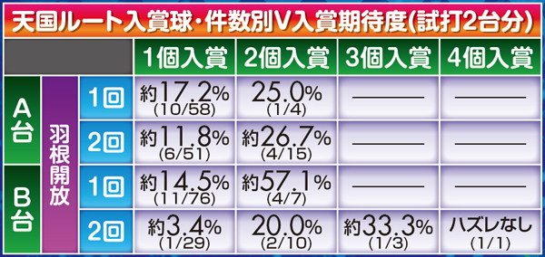 実戦値からも、天国ルートからヘブンズクルーンへ複数入賞するほどV入賞率が高まることが伺える。これは単発入賞だと、玉が暴れやすくV穴を蹴ってしまうためと思われる。そのため、複数入賞でもクルーン内で玉がまとまり、勢いを殺し合うことがSPパターンと言えるのだ。