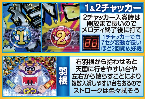 国での複数入賞がV入賞率アップとなるため、それを生み出す2チャッカーや羽根に拾われやすい台を打つことが重要となる。さらに、羽根2回開放前のタイムラグで打ち出しを止めたり、羽根左側以外のストロークを試すといった、細かな技を意識しながら打ち、台ごとのクセを見抜くことが勝率アップの秘訣となるだろう。