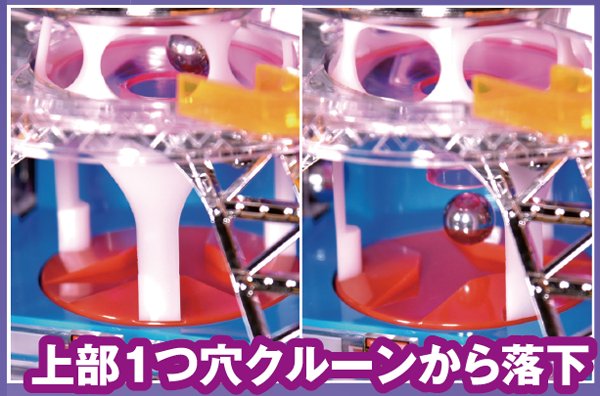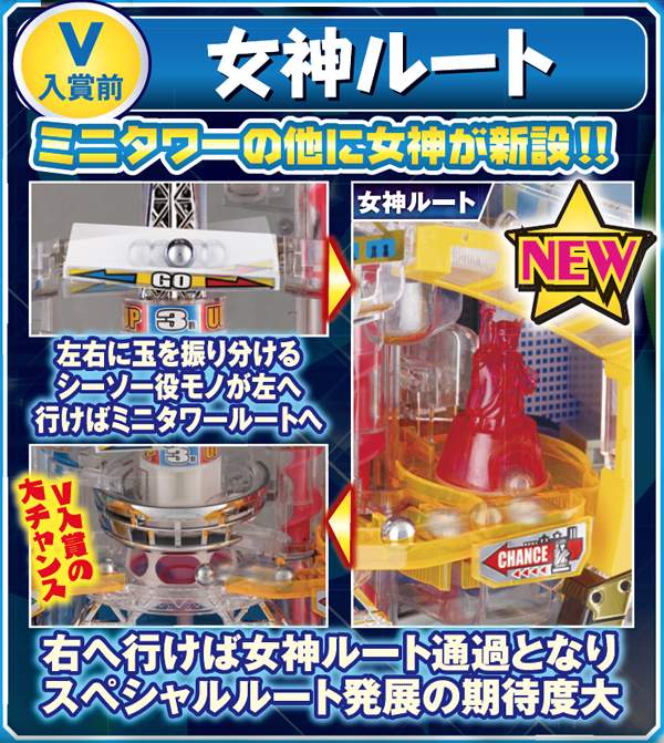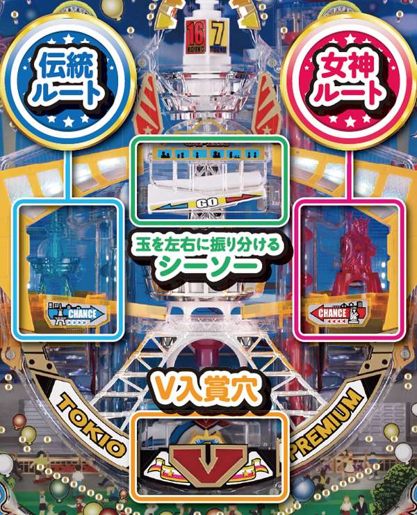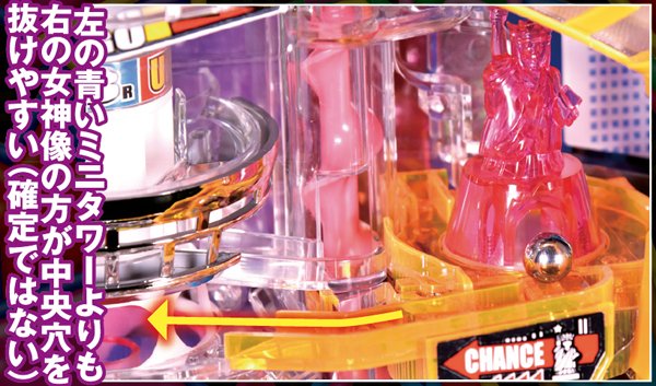 役モノ右側にそびえるピンクの女神像の股を玉が抜けるとSPルートへと向かう。女神像は青いミニツリーに比べ小幅に動くため、玉が中央穴を抜けやすく、SPルートに高確率で向かう仕組みになっている。そのため役モノ入賞直後に女神像に振り分けるシーソーでの玉の動きが、最初の見どころとなるのだ。