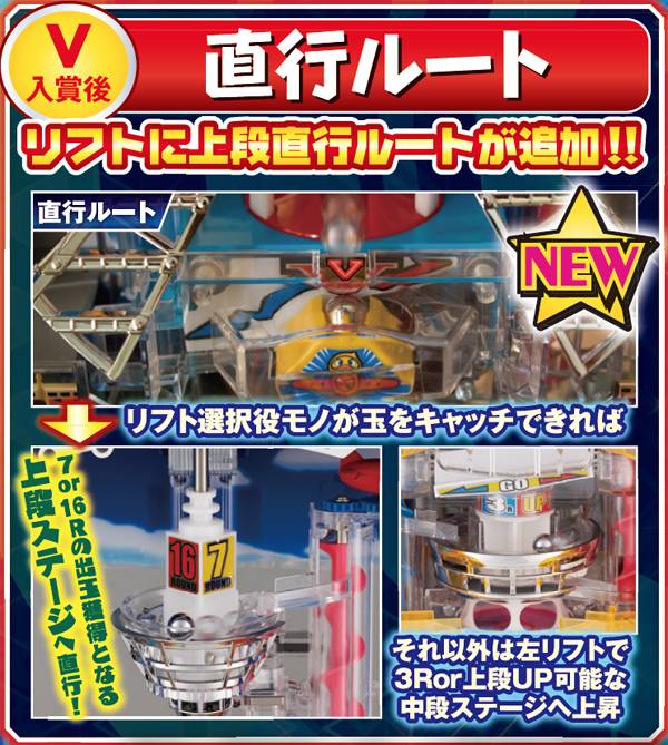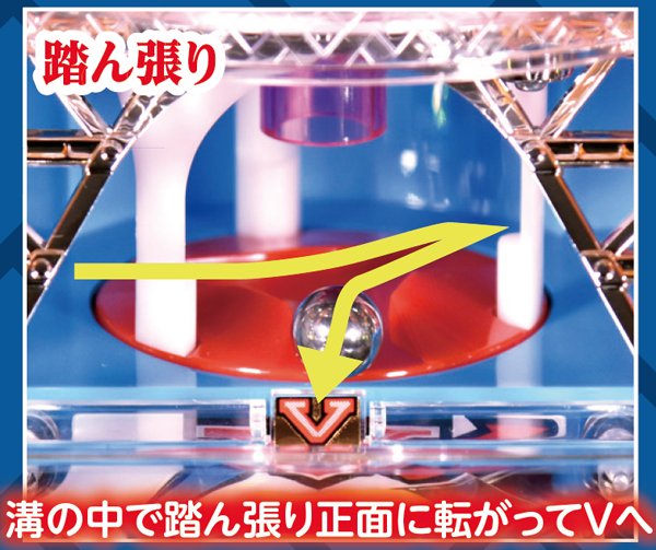「1」or「2」チェッカーへ玉が入賞し羽根が開放→羽根が玉を拾えばタワー役モノ内部でのV入賞抽選となる。今作ではV入賞の前後に新たに上記2つのルートが設けられ、いずれも大当り&大量出玉獲得に重要なアシストをしてくれるのが特徴だ。