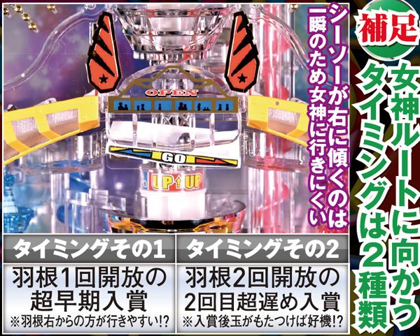 女神ルートが加わったものの、羽根に拾われた玉の大半は左ルートを経由する。よって、前作同様、いかに直進してSPに流れるかが最大の肝。今回はノーマルルートが弱くなっている節があるため、ことさらSPが重要となる。