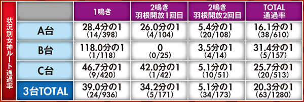 2回開放の2回目が他の開放に比べ桁違いに女神ルートに行きやすい。2チャッカーが甘い台ならチャンスだ。
