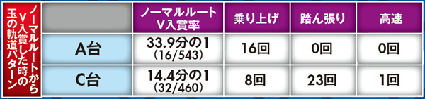 ノーマルルートのV入賞パターンに注目した場合、踏ん張りの発生率がそのままV入賞率の差に直結していた。乗り上げしか発生しないA台のような台には要注意だ。