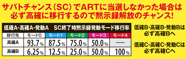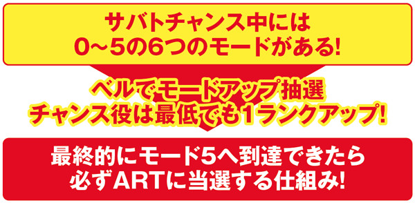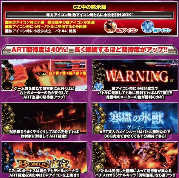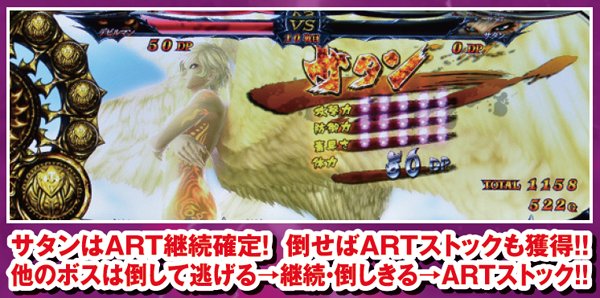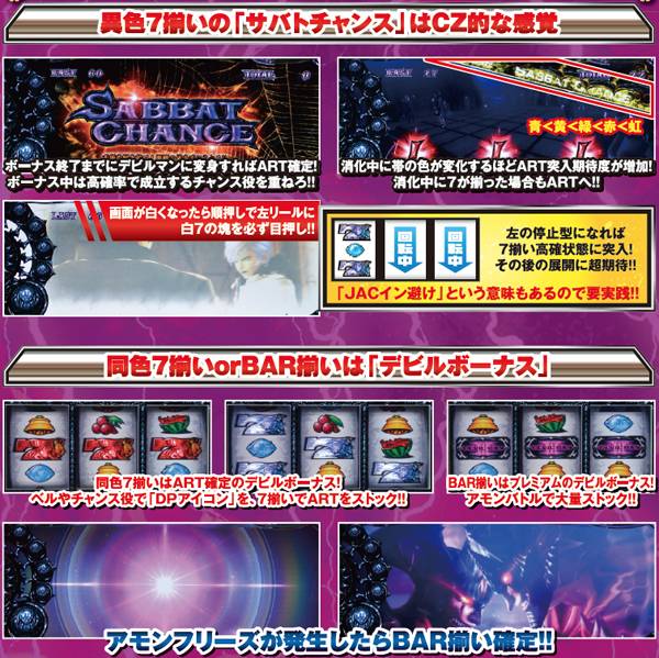 普段お目にかかるのは基本的に異色ボーナスのサバトチャンス。消化中は帯の色が変化するほどART当選に期待でき、7揃いはその時点でARTが約束される。同色7揃いやBAR揃いはART確定&デビルボーナスが発動。後者はプレミアムで、ART大量ストックが見込める。