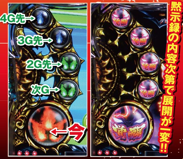 通常時はチャンス役成立で黙示録開放のチャンス。CZ中、ART中は常に黙示録が表示され、アイコンと成立役の兼ね合いで展開が大きく左右される。なお、アイコンは下から順に消化され、チャンス役などを機にアイコンが変化することもある。
