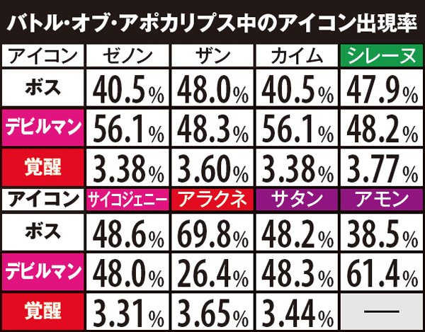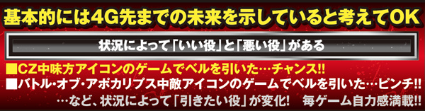 4G先の未来を示す黙示録…その斬新システムを擁するエレコの「デビルマンⅢ-悪魔ノ黙示録-」が登場。 出玉の主軸は1G純増約2枚のART機能で、主な突入契機はボーナスとCZ。これだけ聞くと別段真新しさは感じないが、本機は出玉にまつわる多くの抽選が先述の黙示録を介して行われるのが最大の特徴である。 |