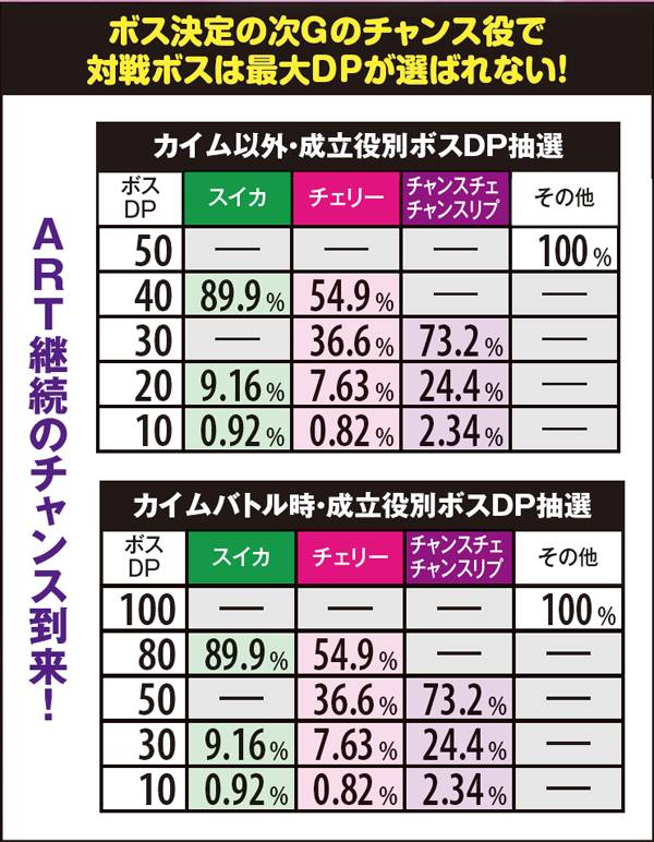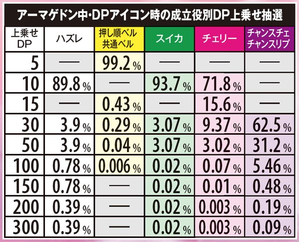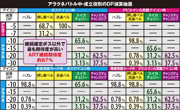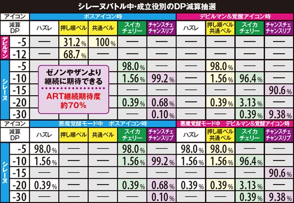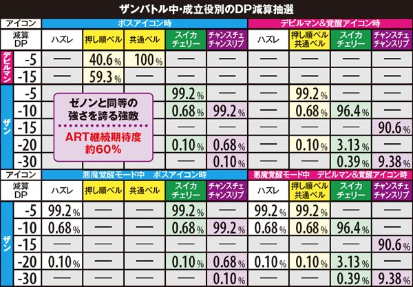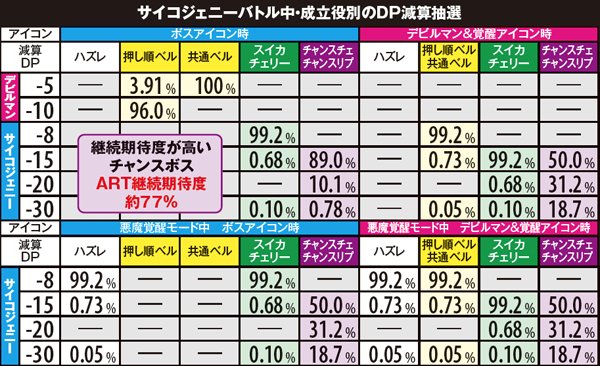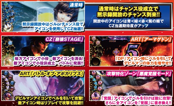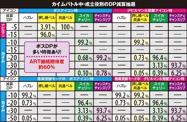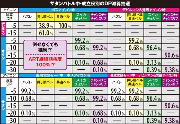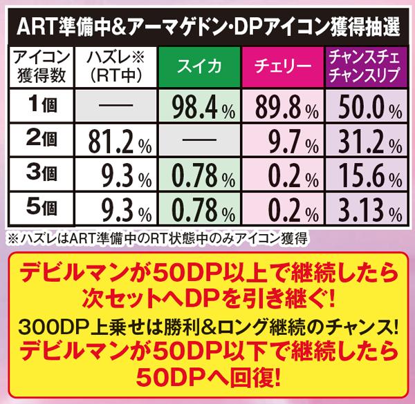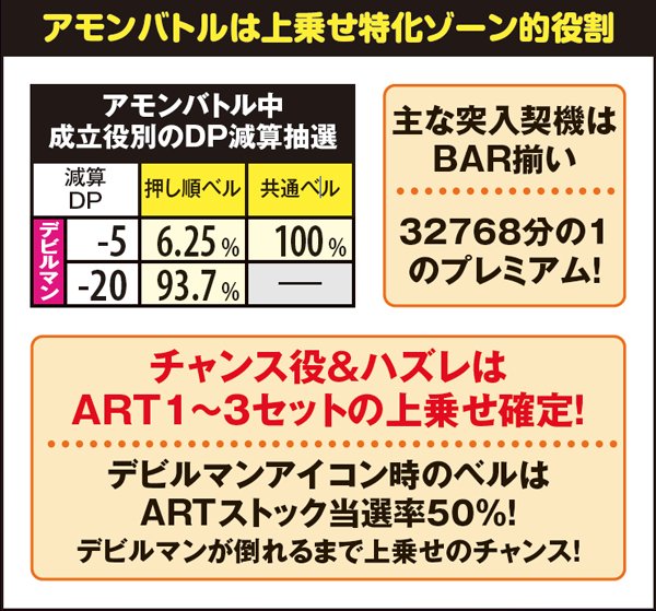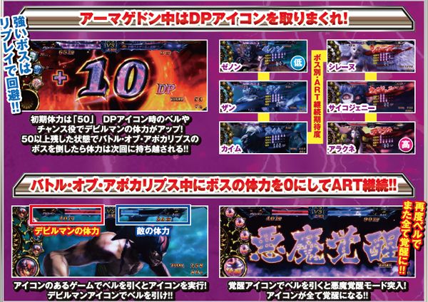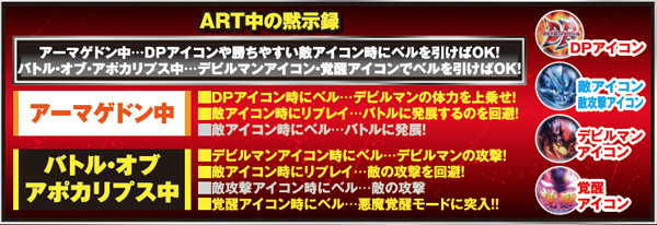 前半はDPアイコン時にベル、後半はデビルマンアイコン時にベル&敵アイコン時にリプレイを引きまくるのが理想。チャンス役にはメリットがあり、例えば前半DPアイコン時なら大量DP獲得、後半敵アイコン時の成立は攻撃への切り替えなどが発生する。なお、ART中は異色ボーナスでもデビルボーナスとなる。