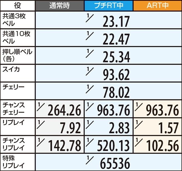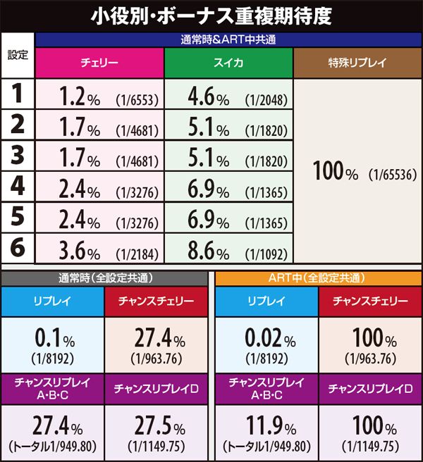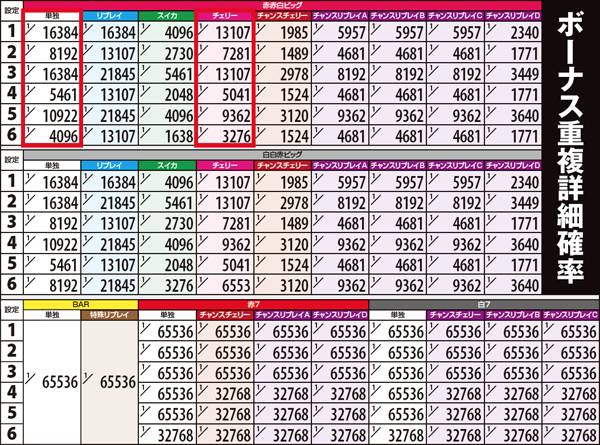 最も設定差があるのは単独orチェリー重複の赤赤白ビッグ確率で、偶数かつ高設定ほど優遇。分母が大きく即効性はないが、数度確認できれば設定6の可能性が高まる。スイカの異色ビッグ重複にも設定差がある点、基本的に奇数設定ならば白白赤ビッグ、偶数設定は赤赤白ビッグが当選しやすい点も把握しておこう。