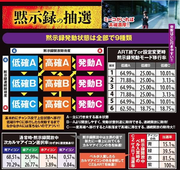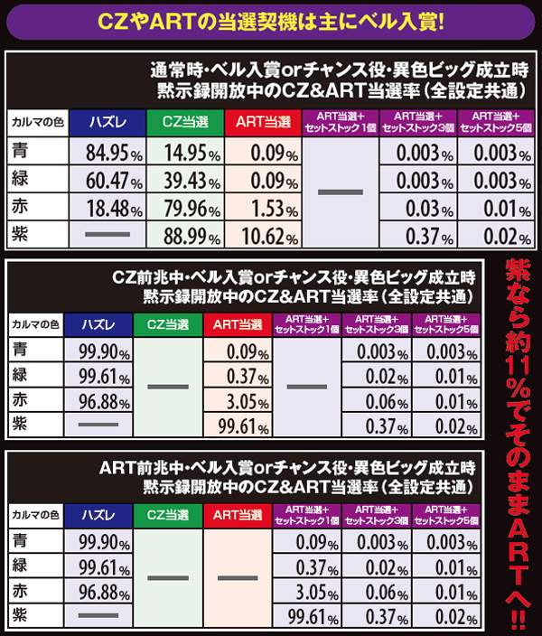 黙示録開放中は如何にして緑以上のカルマ時にベルやチャンス役を引けるかがポイント。CZ当選後はART&セットストック、ART当選後はセットストック抽選が行われ、紫は常に激アツだ。