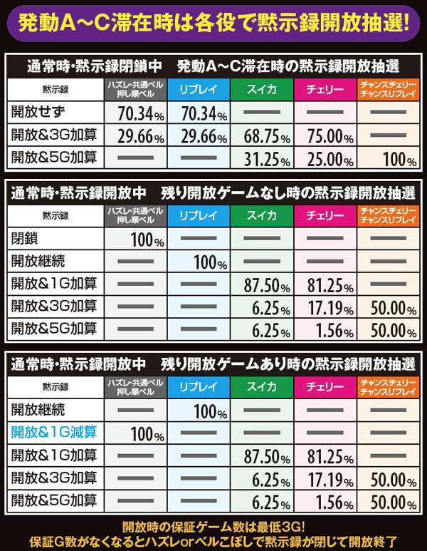 黙示録発動状態は全9種類で、発動A~Cへ移行すると各役成立時に高確率で黙示録開放抽選。状態がBやCへ移行するとなかなかAに転落しないのも特徴のひとつで、ひとたび移行すれば黙示録連続開放に期待できる。なお、黙示録閉鎖中や開放中における各役成立時の各種抽選割合はご覧の通りだ。