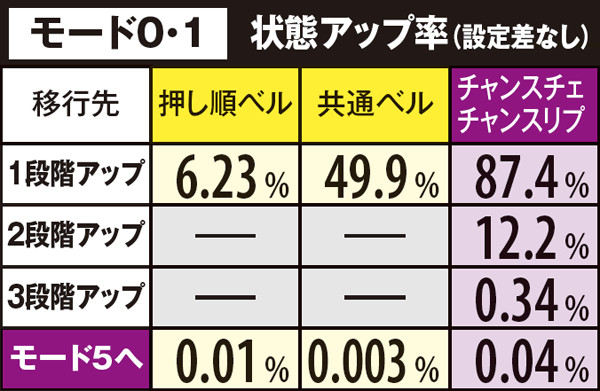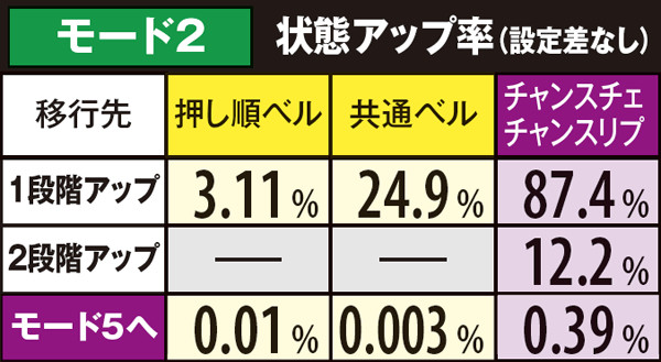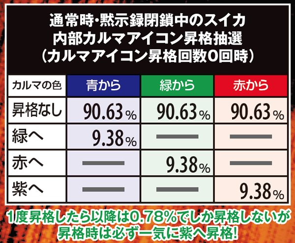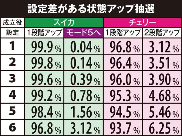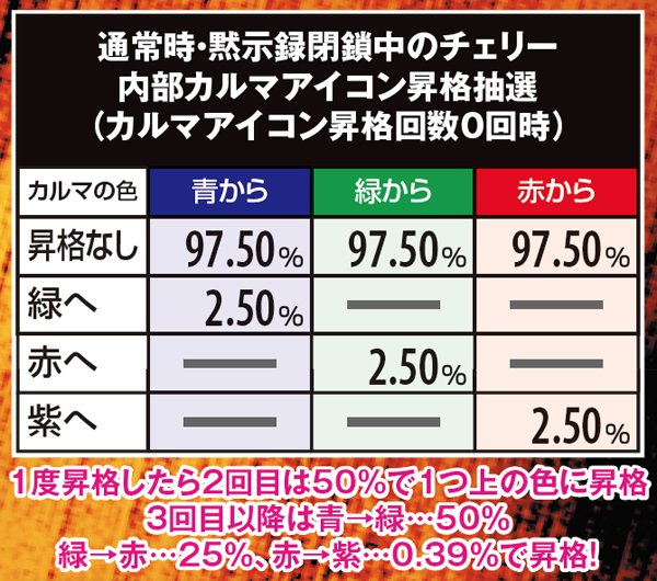 昇格契機はスイカとチェリーで、1段階昇格する期待度はスイカの方が上、ただし、チェリーはひとたび昇格すると以降は高確率で1つ上の色に昇格するといった特徴がある。