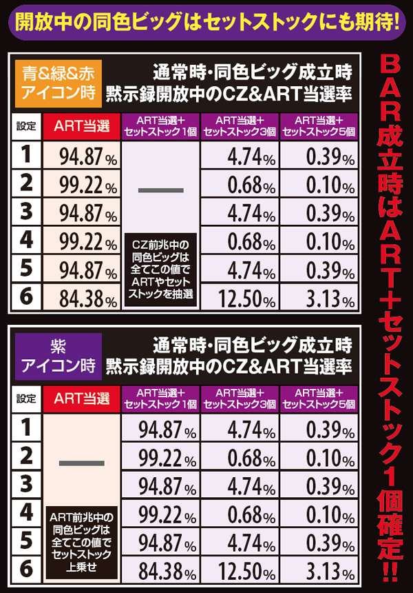 黙示録開放中の同色ビッグ成立時、奇数設定&設定6はセットストックのチャンス。紫アイコン時の成立は設定を問わずストックが確定し、奇数設定&設定6は複数ストックにも期待できる。