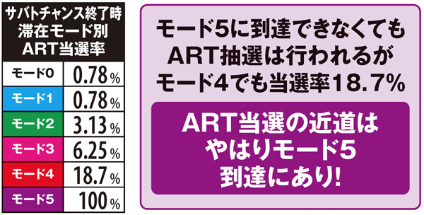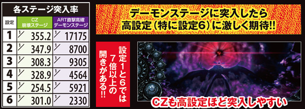 CZへは高設定ほど突入しやすいが、これ以上に数値差が顕著なのがART直撃高確であるデーモンステージへの突入率。設定1と6とでは7倍以上の開きが生じているので、序盤で突入が確認できた場合はしばらく打ち続けておくべきだろう。