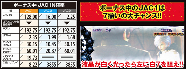 白7を狙ってハズしたJACの種類によってその後の展開が激変。JAC1なら約8分の1で7揃い炸裂となるので大チャンスだ。また、JAC2成立後はチャンス役確率が大幅アップするので、こちらもアツい。