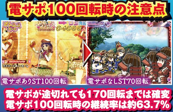 本機は電チュー大当りで付与される電サポ回数が異なる。6R確変の半分は電サポ100回転となり、残りの70回転はヘソでSTを消化する事になるため、電サポ抜け後の即ヤメ厳禁だ。