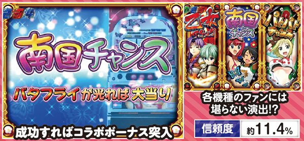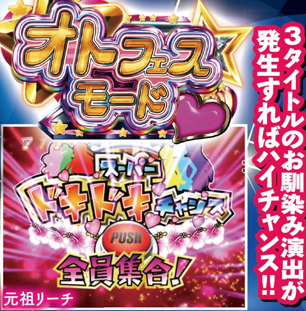 平和お馴染み3大萌えタイトル『南国育ち』『戦国乙女』『麻雀物語』のかわいいキャラが一体となった機種が登場。 スペックはライトミドルながら、ひとたびST「オトフェスモード」に突入すれば、継続率約82%、大当りの半数が50%と大量出玉の獲得に期待が持てる。 乙女たちの夢のような共演に心躍ること間違いなしだ!! |