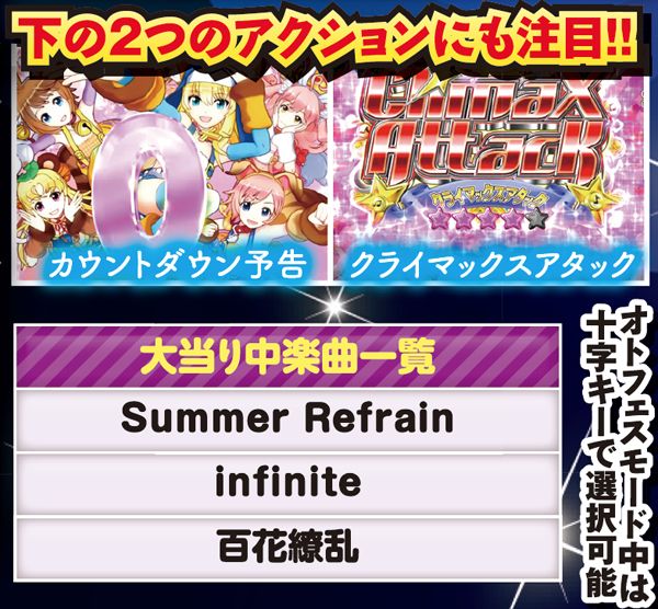 ST中は3タイトルでお馴染みだったリーチが発生すれば、いずれも大チャンス。また、大当り中は上記3曲が選択できるお楽しみ付き。