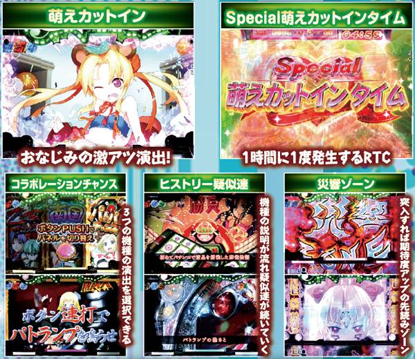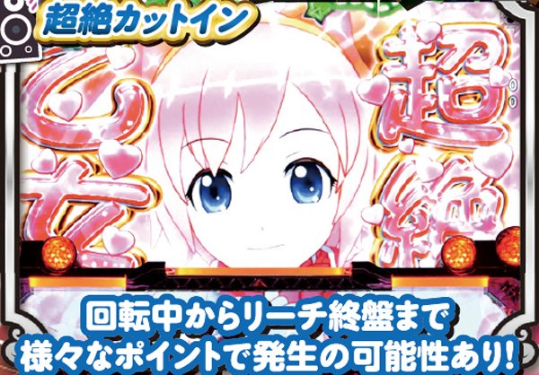 歌や踊り以外にも本機を彩る演出は多数。戦国乙女ではお馴染みの萌えカットインや各機種の説明が流れるヒストリー疑似連など3タイトルの演出を上手く取り入れているのでファンにはたまらない一台だ。