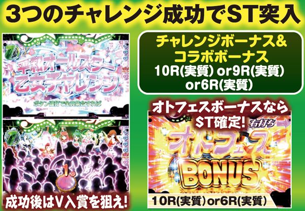 オトフェスボーナス以外の大当りはラウンド中のチャレンジ成功でSTへ突入。しかし、ST中の6R確変は半分が電サポ100回転で終了するため、残りの70回転はヤメないように注意しよう。