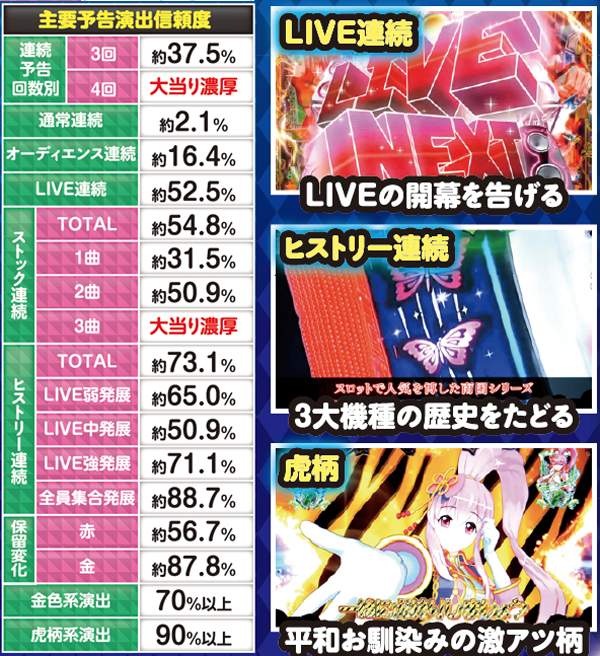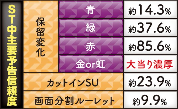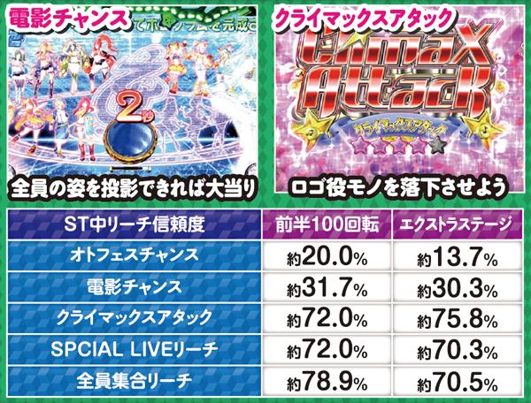 ST専用演出の注目はクライマックスアタック。信頼度7割超の激アツ演出だ。また、LIVE系リーチは通常時同様に期待大。3大マシンのお馴染みの演出が展開する元祖リーチは発生した時点で連チャン濃厚。