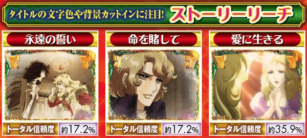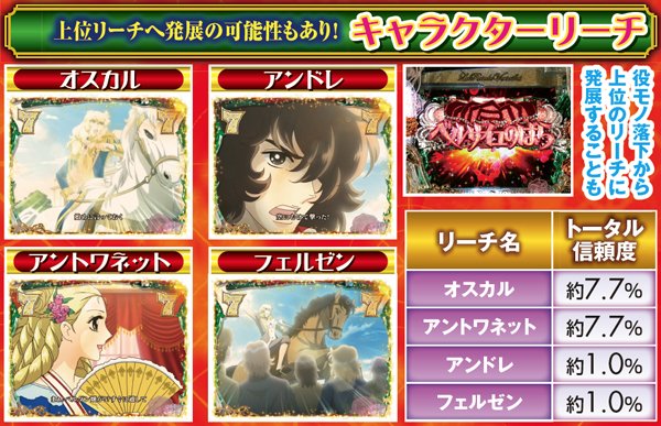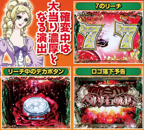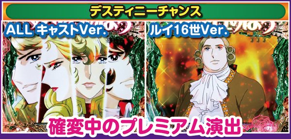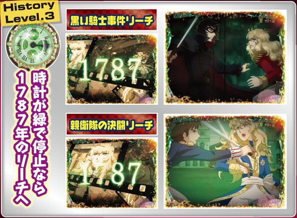 激動のフランス革命期を描いた少女マンガの金字塔、『ベルサイユのばら』が登場。 確変は次回大当りまで継続するタイプで、確変継続率は66%となっている。 演出面では液晶下から現れる「Vウォッチ」と呼ばれる時計役モノに注目で、時間が進むごとに期待度の高いリーチへと発展する仕組みだ。 |