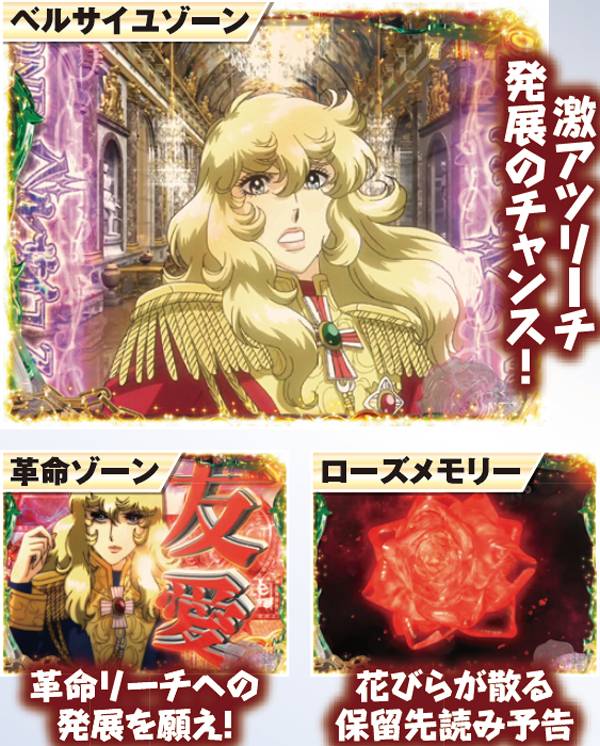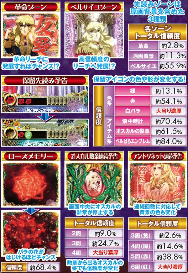 多彩な予告はゾーンや保留、連続予告のどれにも高信頼度演出が存在する。上記の演出信頼度一覧を参考にしつつゾーンならベルサイユゾーン、保留なら赤や重要アイテムといったように、アツい予告演出をチェックしておこう。