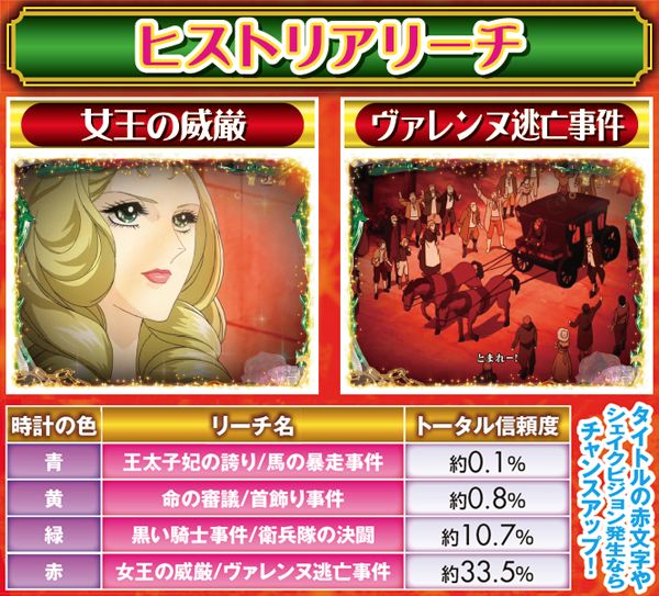 時計役モノの色で信頼度が変化していくヒストリアリーチは赤なら期待度3割超。ストーリーは愛に生きるが最もアツいが、タイトルの色や背景カットインなどリーチ中に出てくるチャンスアップの複合も重要となる。