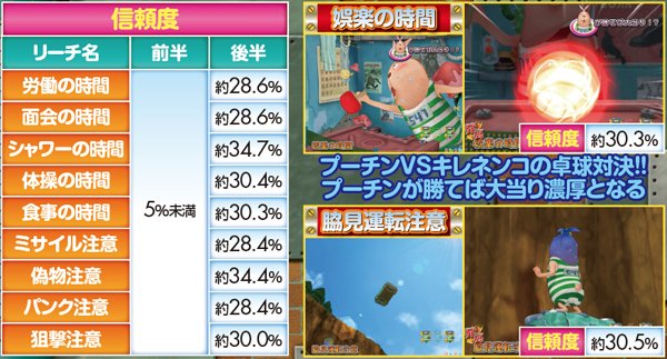 前後半が存在するリーチは11種類で、液晶左下に「発展」の文字が表示されたら後半へ突入。いずれも前半だと大当りは見込めないが、後半に発展すれば信頼度約3割と大好機となる。なお、娯楽の時間と脇見運転注意は出現した時点で後半濃厚だ。