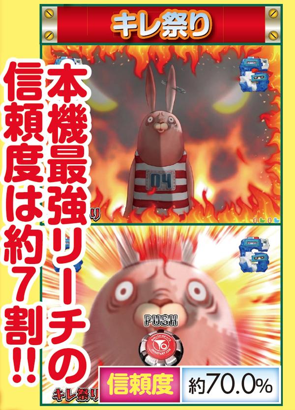 前後半が無く、発展した時点で激アツとなるのがこちらの3リーチ。いずれも半数以上が大当りに結びつくが、本機最強のキレ祭りに発展すれば歓喜は目前に迫る。