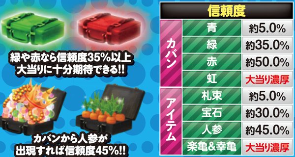 大当りに欠かせない保留変化は緑以上なら大チャンス。また、保留の中から出現するアイテムも重要で、期待薄の保留色でも宝石や人参が絡めば一転して好機到来となる。