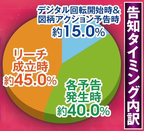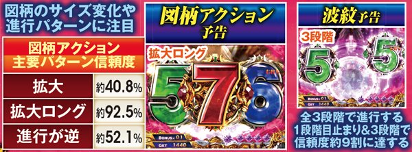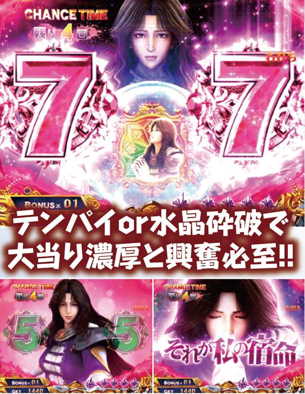 図柄テンパイもしくは予告段階で水晶が割れると大当り濃厚、また告知タイミングは様々。図柄アクションやセリフに注目だ。