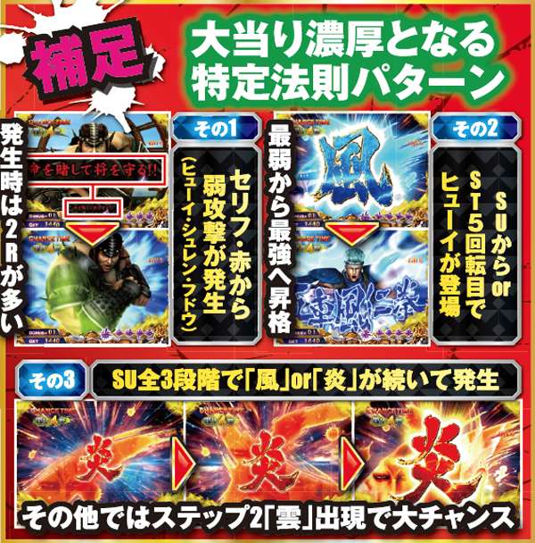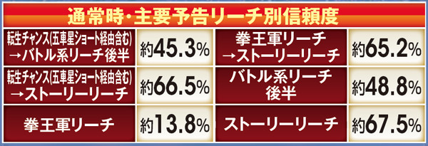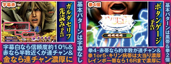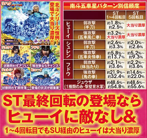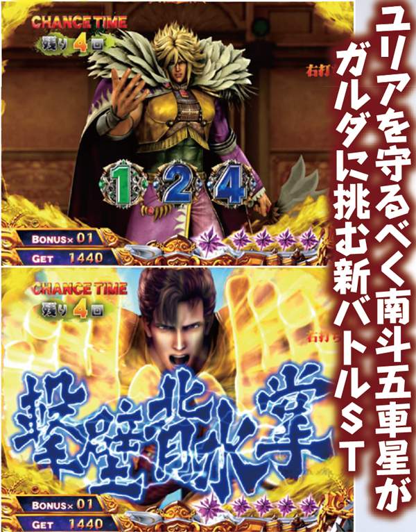 今作のバトルSTでは、南斗五車星がガルダに勝てば大当り濃厚。味方キャラがジュウザなら激アツで、リハクなら大当り濃厚だ。反対に、すっかり最弱キャラの烙印を押されたヒューイでも、ST最終回転での対峙や、SU予告でのヒューイ止まり&登場が勝利濃厚という嬉しい裏法則も存在するため、見逃し厳禁!