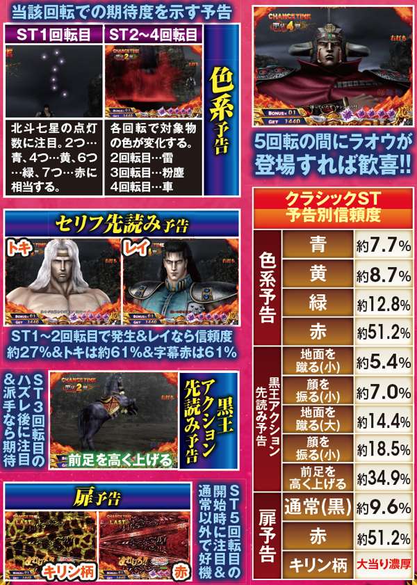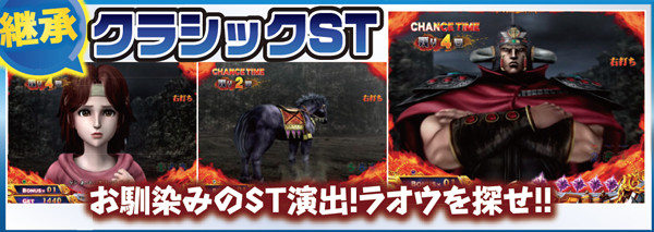 ラオウステージに相当する本STは前作から大きな変更点はナシ。色変化は当該回転の大当り期待度を、セリフや黒王号のアクションは次回転以降の大当り期待度をそれぞれ示唆する。赤系チャンスアップ発生で期待度は急上昇!