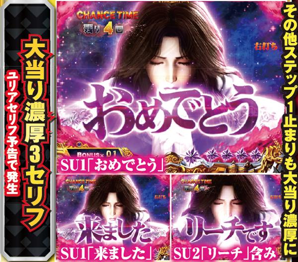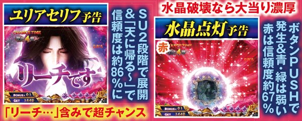 一発告知STではユリアのセリフに「リーチ」を含んだものや、ステップ1止まりも大当り濃厚となる。
