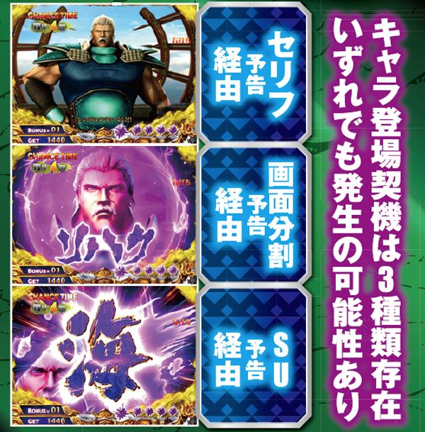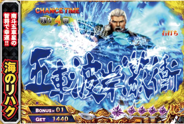 主役が南斗五車星となるバトルメインのSTで、戦うキャラによって勝利期待度が変化。海のリハクが選択されれば大当りはすぐそこ!?