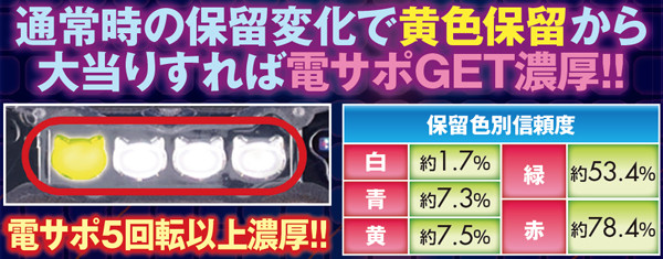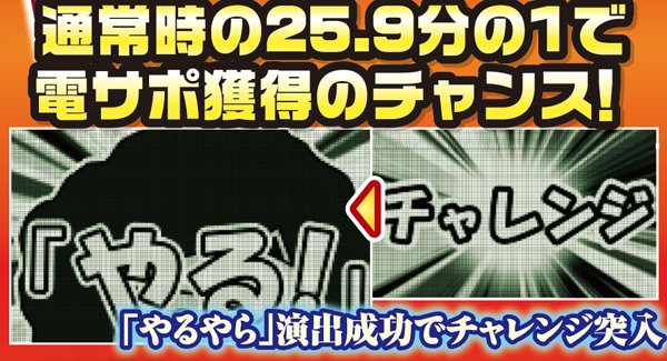 電サポ獲得には初当り後に移行する演出を連続で突破することが必要。一度でも失敗すると電サポなしとなるが、全チャレンジ演出をクリアできれば最低でも5回転の電サポが獲得できる。回数期待度それぞれ内容によって変化するので注目しよう。