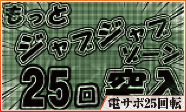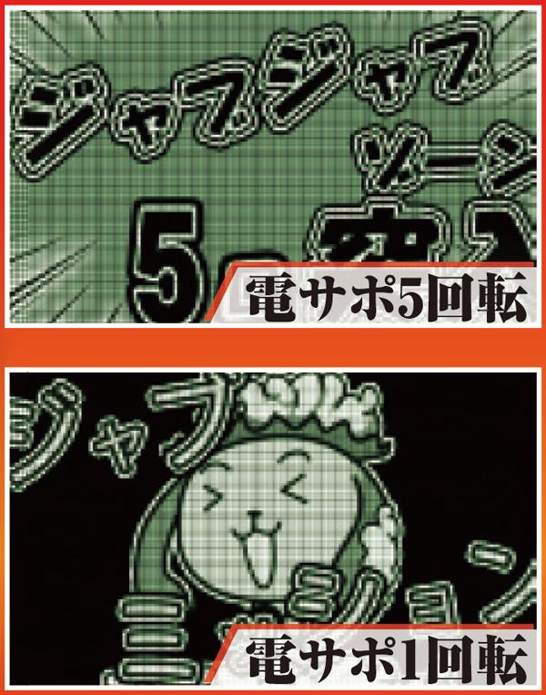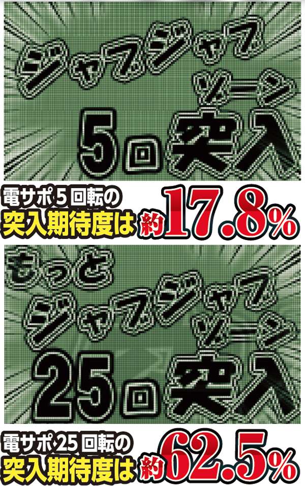電サポ中に大当りを引けば高継続を誇るST65回転のスーパージャブジャブラッシュに突入。電サポ回数によって突入率は変化し、最大回数の25回転なら期待度6割以上と大チャンスだ。