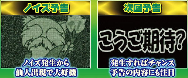 通常時の予告は多数あり、なかでも「ノイズ予告」は仙人出現で好機となる。他にも、電サポ獲得の大チャンス演出「ジャブジャブランプ」は点灯すれば、その後の展開に期待だ。
