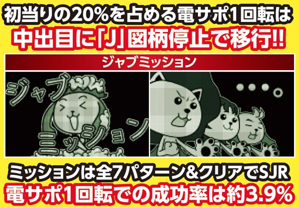 中図柄に「J」が停止すると移行する電サポ1回転限定のミッション。全7種類の演出が存在し、成功でスーパージャブジャブラッシュ突入となる。