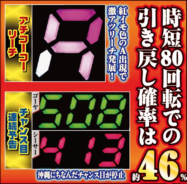 沖縄をモチーフにしたシンプルな7セグ機。 ST20回転+時短60回転のハイビタイムは継続率約86%と連チャンの期待大。ただし、突入には初当り後の時短80回転以内での引き戻しが必要となる。 |