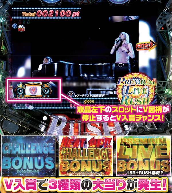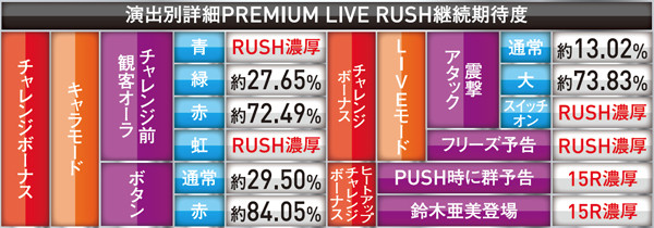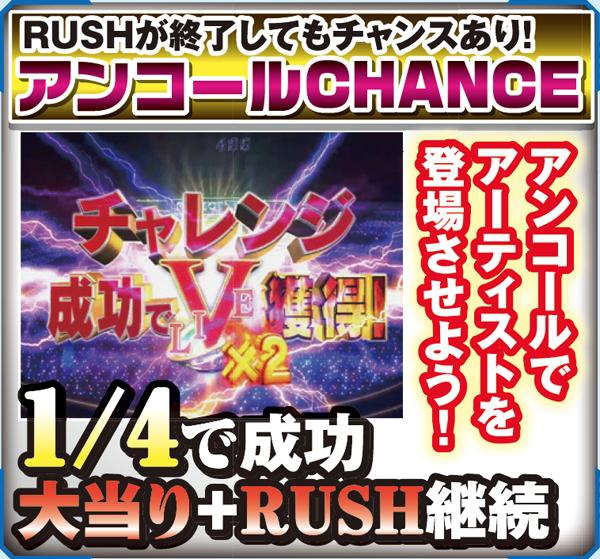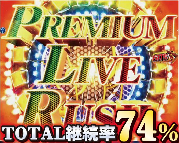 継続率62%のPREMIUM LIVE RUSH終了後にはアンコールCHANCEに突入。これに成功すれば大当りとなりRUSH継続となるのだ。しかもその成功率は1/4。よってトータル継続率は74%となるのだ。