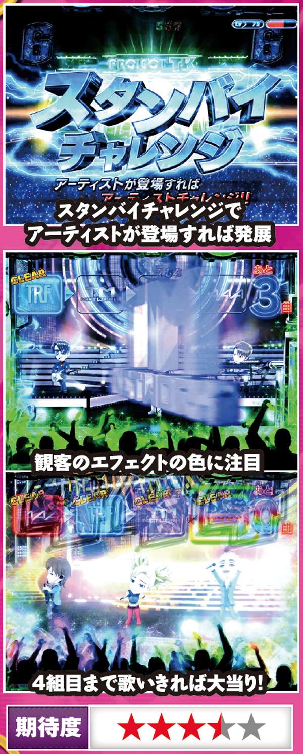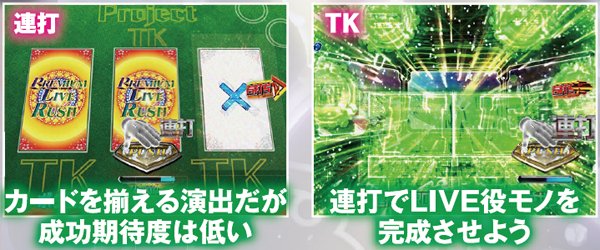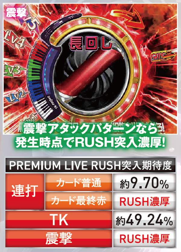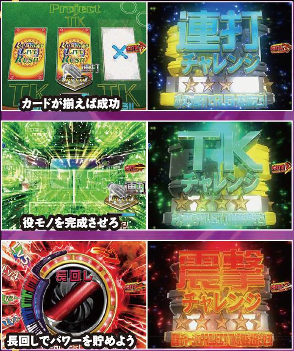 チャレンジボーナス以外の大当りは発生した時点でRUSH継続が確定となる。チャレンジボーナスでキャラモードを選択した場合は、ボタンの色に注目。LIVEモードでは、震撃アタックが大きいと期待度は高い。