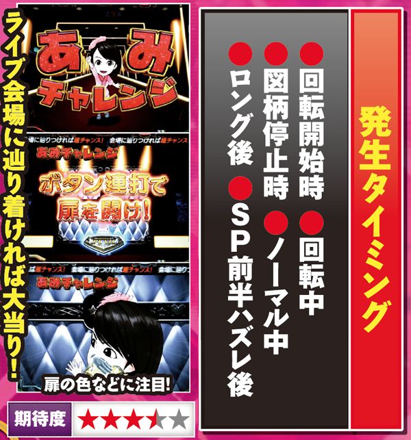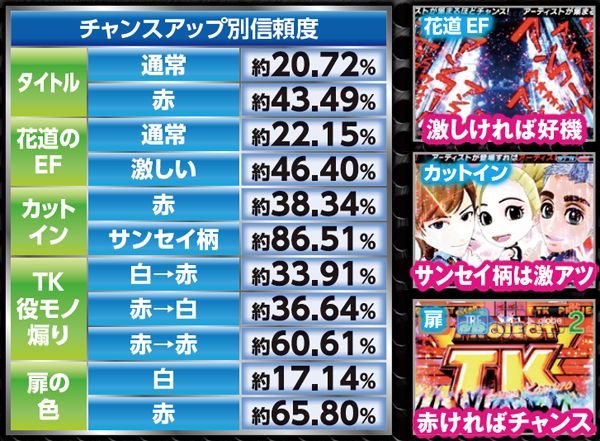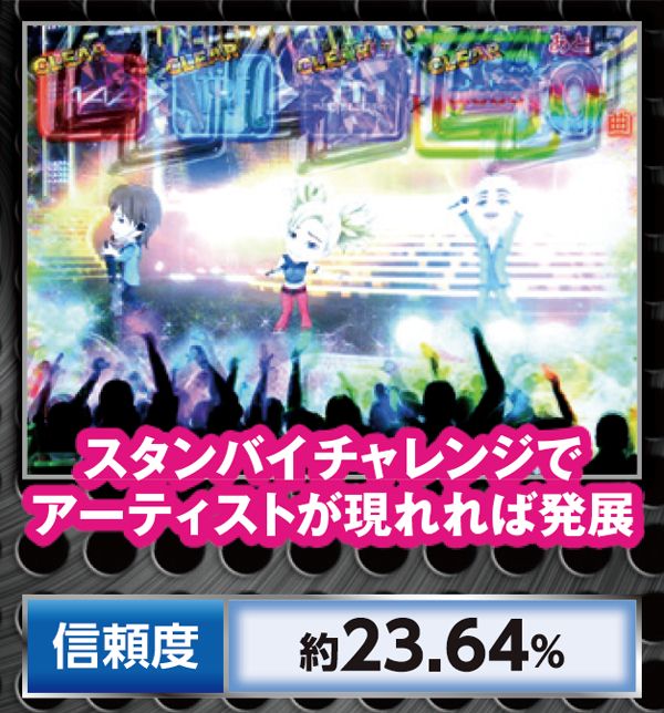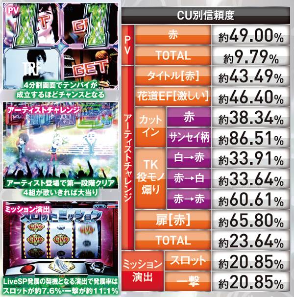 テンパイ数が多いほどチャンスとなるPVリーチは、背景が赤なら信頼度は49%に達する。アーティストチャレンジも同様に、赤系チャンスアップの出現に期待しよう。2種類あるミッション演出は信頼度は同じだが、LiveSPへの発展率が異なる。
