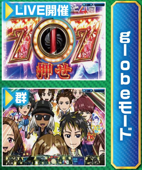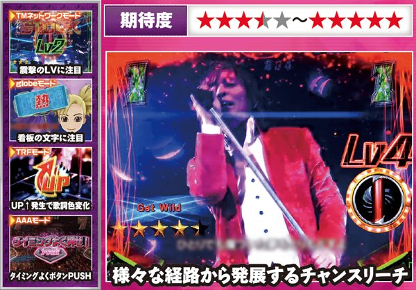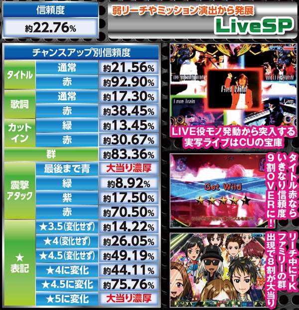 歌系の弱リーチやLive図柄停止から発展。タイトルや歌詞の色、群などの他、モード専用も含めたチャンスアップも豊富だ。