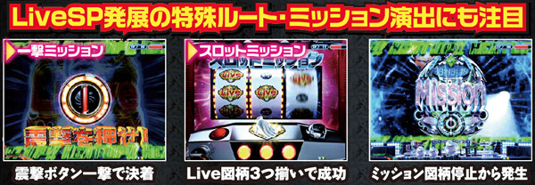 ミッション図柄が停止すると発生するミッション演出。「スロット」と「一撃」の2パターンあり、見事Live図柄を停止させられるとLiveSP発展となる。