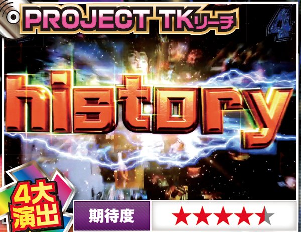 PROJECT TK図柄停止から発展する。「history」と表示され、TKの歴史が紹介されると大当りは目前だ。