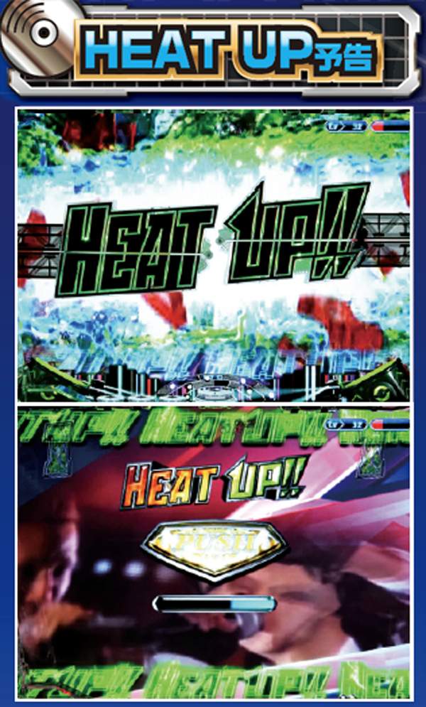 HEAT UP役モノ完成が続くほどアツい連続演出。赤にまで到達すればビッグチャンスとなる。
