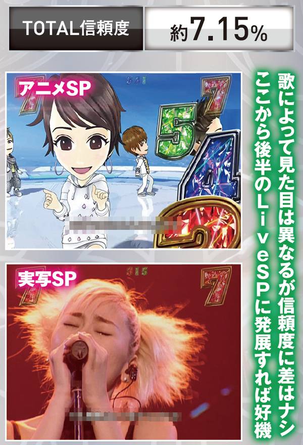 2Dキャラのアーティストが名曲を披露して当たりを狙うリーチだが、信頼度は低い。LiveSPリーチへの発展を願おう。